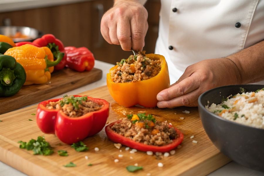 Wskazówka eksperta: Aby papryka zachowała intensywny kolor po upieczeniu, blanszuj ją przez 2-3 minuty w osolonej wodzie z dodatkiem łyżki octu jabłkowego przed nadziewaniem.