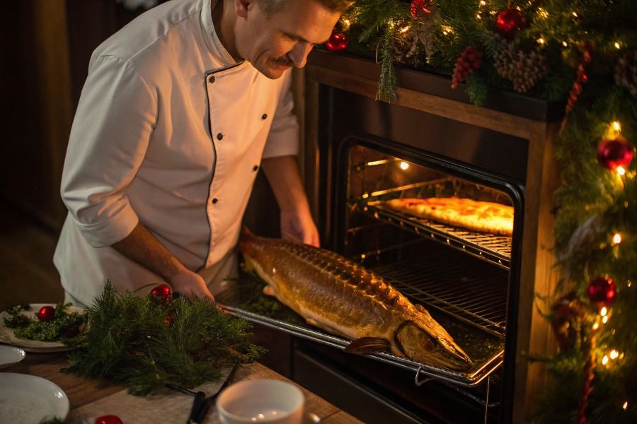 Pieczenie jesiotra to jedna z najbardziej efektownych metod przygotowania tej szlachetnej ryby na wigilijny stół. Przed pieczeniem warto naciąć skórę jesiotra w kilku miejscach, co zapewni równomierne przenikanie aromatów i równe pieczenie.
