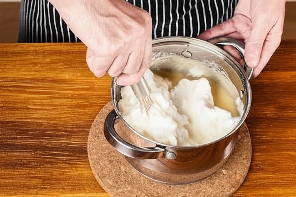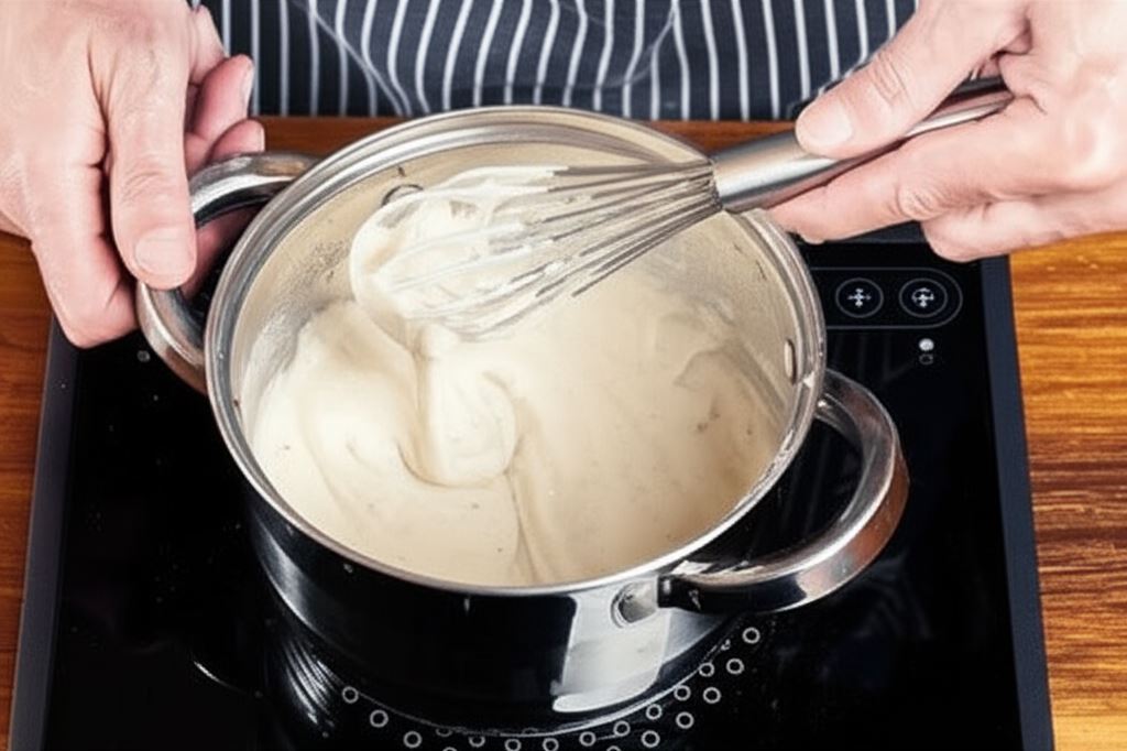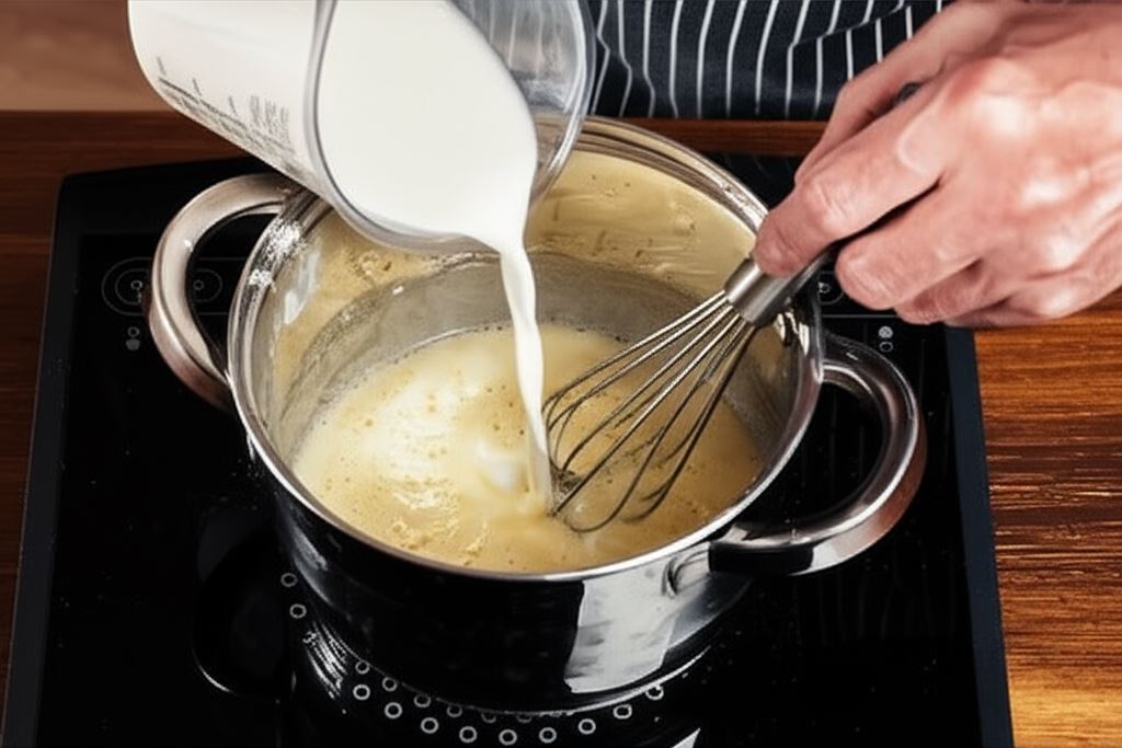 Roztop masło w rondelku i wsyp mąkę. Przygotuj zasmażkę. Wlej mleko i bardzo intensywnie zamieszaj.