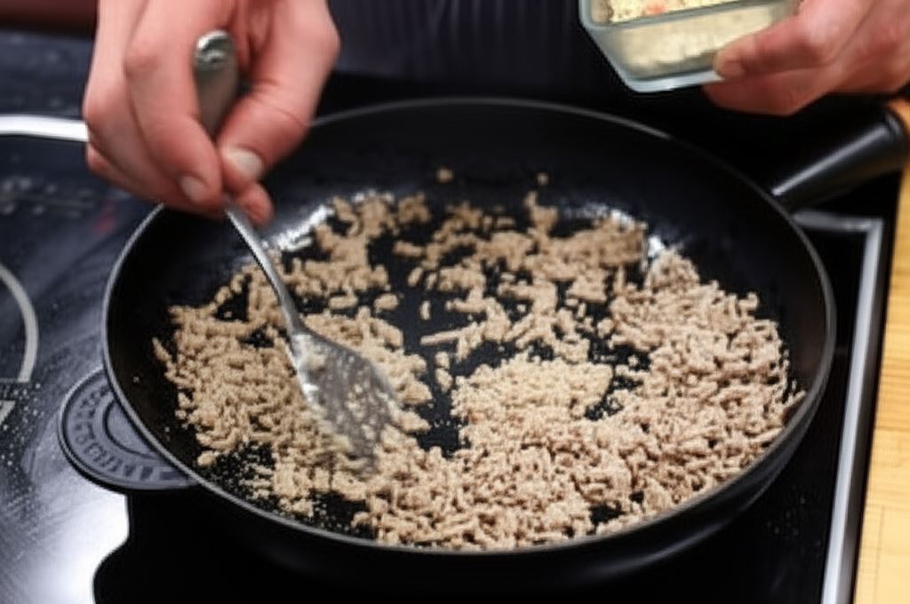 Mięso mielone podsmażaj na rozgrzanym tłuszczu. Smaż aż stanie się kompletnie suche, po czym przypraw je całym opakowaniem Przyprawy do mięsa mielonego Knorr, która nada daniu perfekcyjnego smaku.