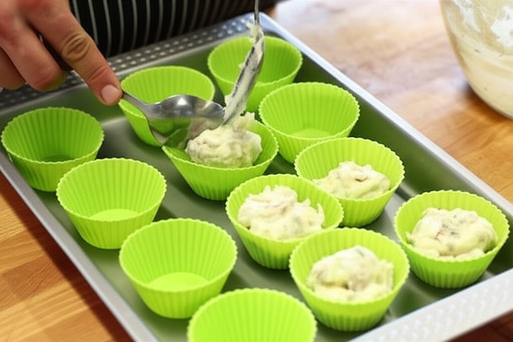 Przeniesione ciasto umieść w foremkach, np. silikonowych, wcześniej wysmarowanych tłuszczem. Foremki wypełnij do ¾ wysokości. Na wierzchu lekko posyp resztą sera. Wszystko umieść w piekarniku rozgrzanym do 190°C i piecz przez 20 - 25 minut. Nie otwieraj piekarnika podczas pieczenia. Wskazówka szefa kuchni: ziemniaki można przyprawić szczyptą gałki muszkatołowej.