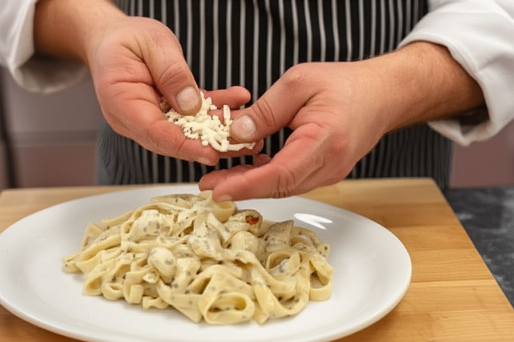 Delikatne kawałki kurczaka otulone aksamitnym, kremowym sosem doskonale komponują się z al dente ugotowanym makaronem. Całość zwieńczona odrobiną startego sera tworzy harmonijną kompozycję smaków, która przeniesie Cię wprost do włoskiej trattorii.