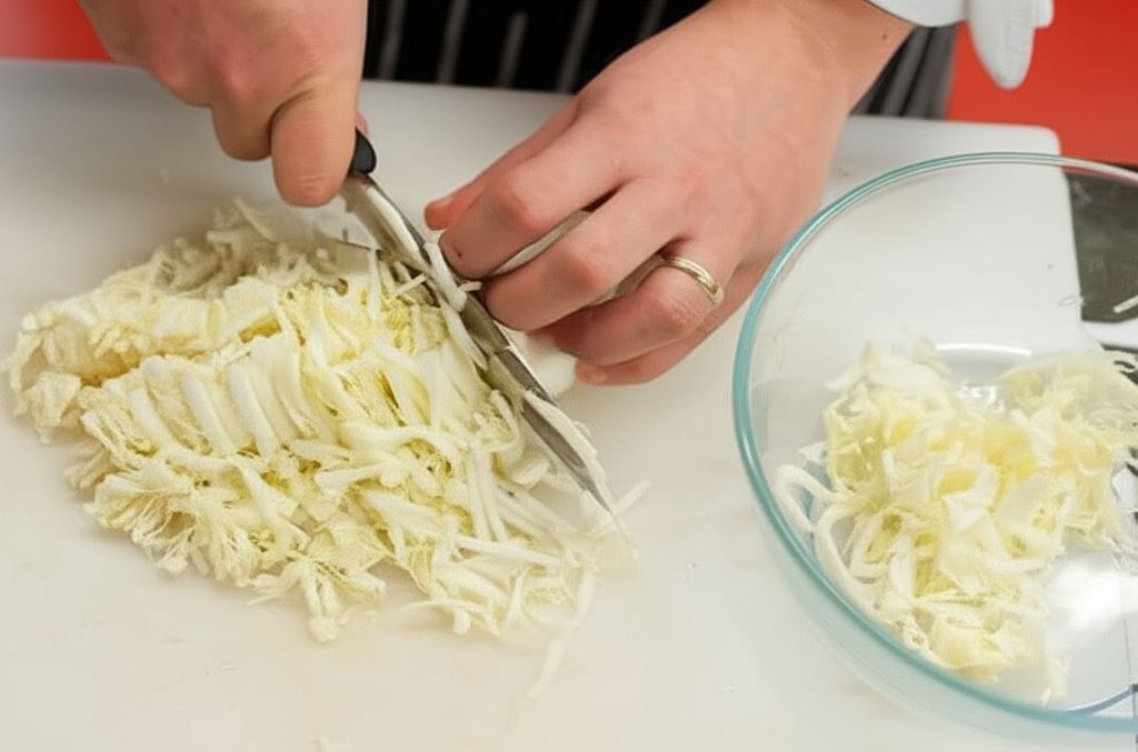 Usuń zewnętrzne liście z kapusty, przetnij ją na pół i poszatkuj w paski.