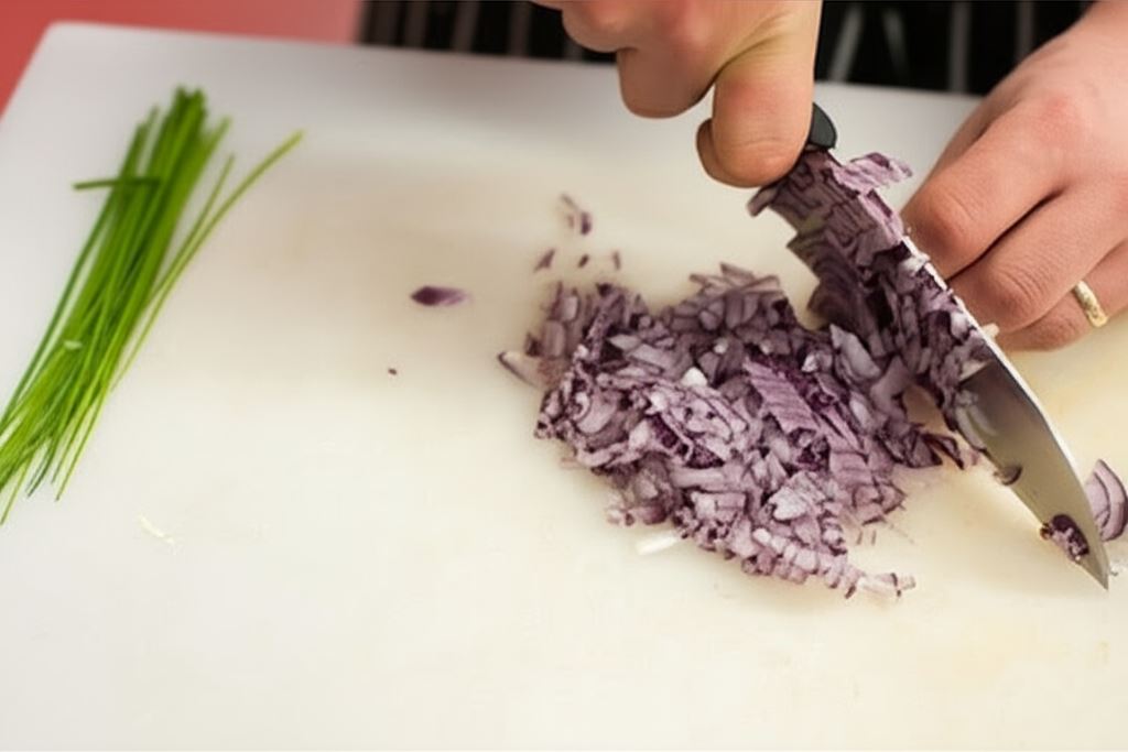 Cebulę obierz i posiekaj w kostkę, szczypiorek drobno pokrój.
