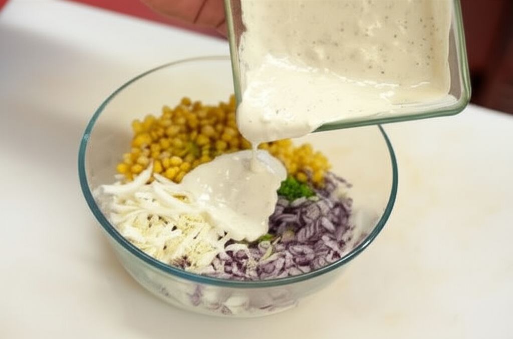 Sekret wyjątkowego smaku tej surówki tkwi w odpowiednio przygotowanym dressingu. Połączenie sosu sałatkowego Knorr z kremowym majonezem i wyrazistym serem tworzy aksamitną konsystencję i bogaty smak, który idealnie komponuje się z chrupkością kapusty i słodyczą kukurydzy. Krótkie schłodzenie przed podaniem pozwoli wszystkim smakom doskonale się połączyć.