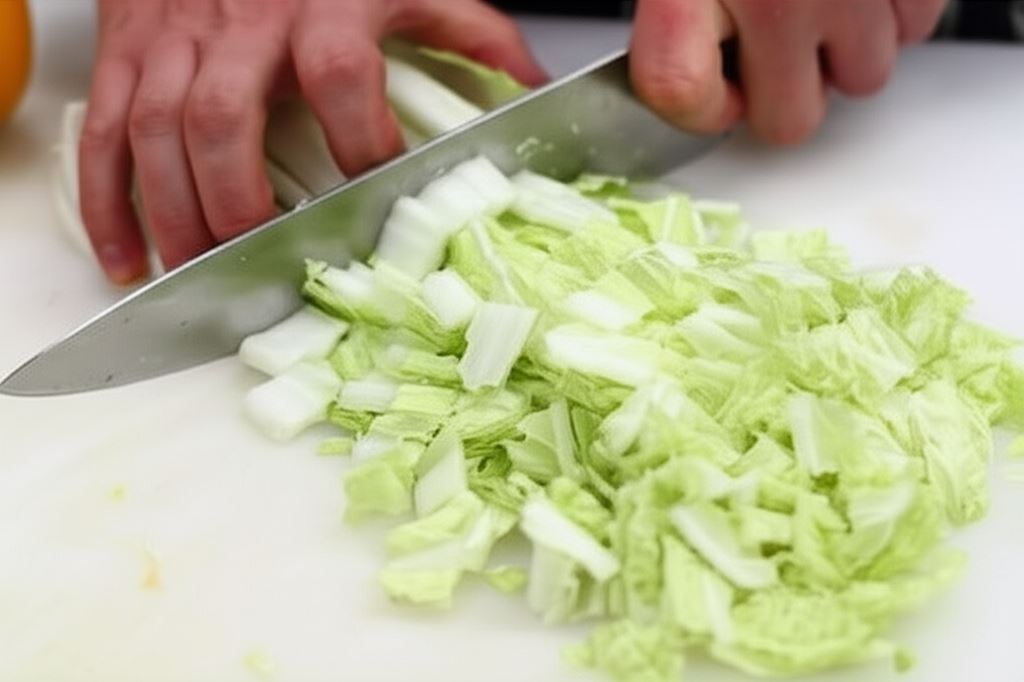 Kapustę zbaw z zewnętrznych liści, przepłucz i wysusz. Potem przekrój ją na połowę wzdłużnie i posiekaj w kostkę.