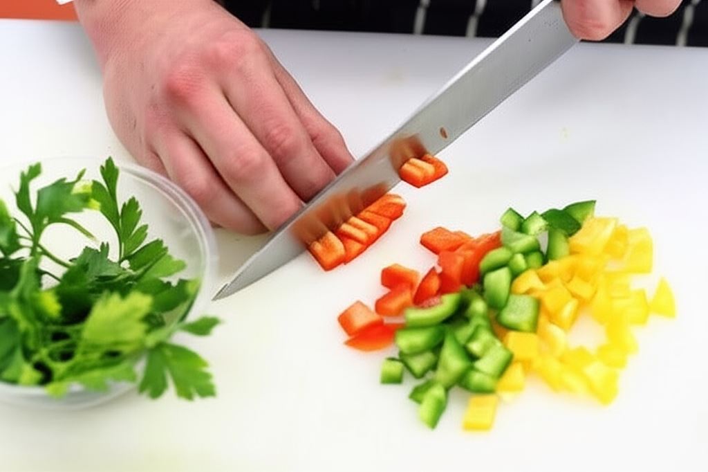 Papryki oczyść i pokrój w kosteczkę. Natkę drobno posiekaj.