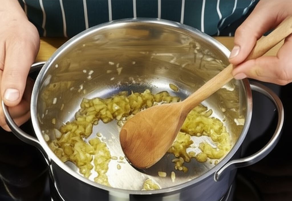 W sporym garnku zrumień lekko na margarynie posiekaną cebulę i czosnek. Po chwili wsyp kapustę i smaż wszystko kilka minut.