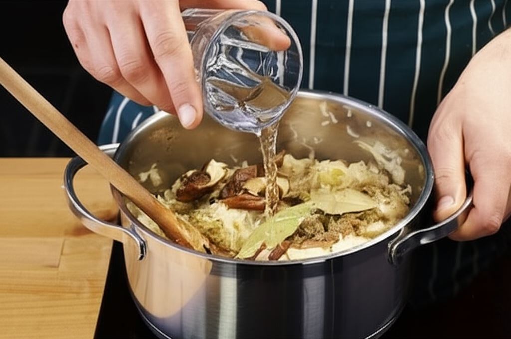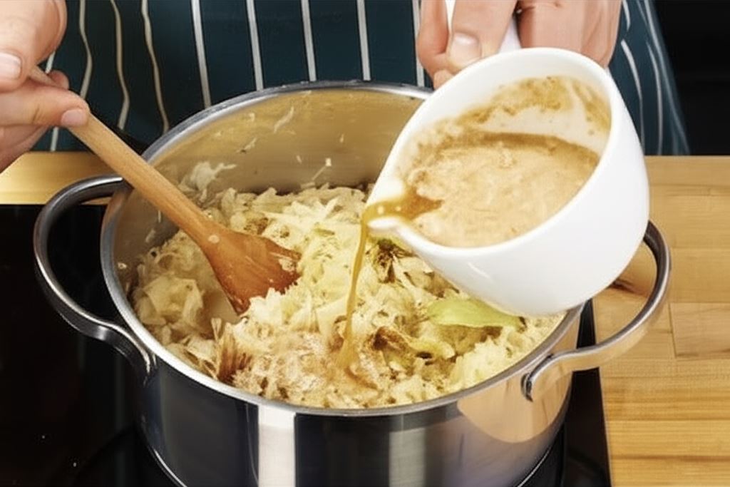 Po tym czasie dolej wodę, aby przykryć całą kapustę. Wsyp wszystkie przyprawy, grzyby i duś na wolnym ogniu, mieszając co jakiś czas około 2 godzin. Jeśli zajdzie potrzeba, uzupełniaj wodę.