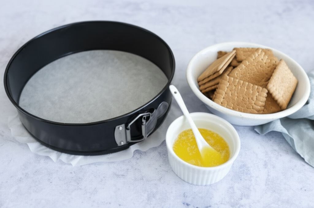 Masło rozpuść. Herbatniki rozdrobnij w malakserze. Wymieszaj z masłem i ułóż na spodzie tortownicy. Wygładź. Wstaw do lodówki podczas przygotowywania masy serowej.