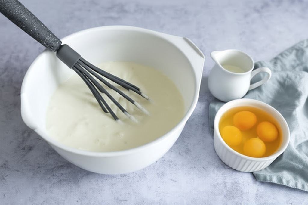 Przygotuj masę z sera. Twaróg wymieszaj przy użyciu rózgi kuchennej z proszkiem budyniowym, cukrem, jajkami i śmietaną.