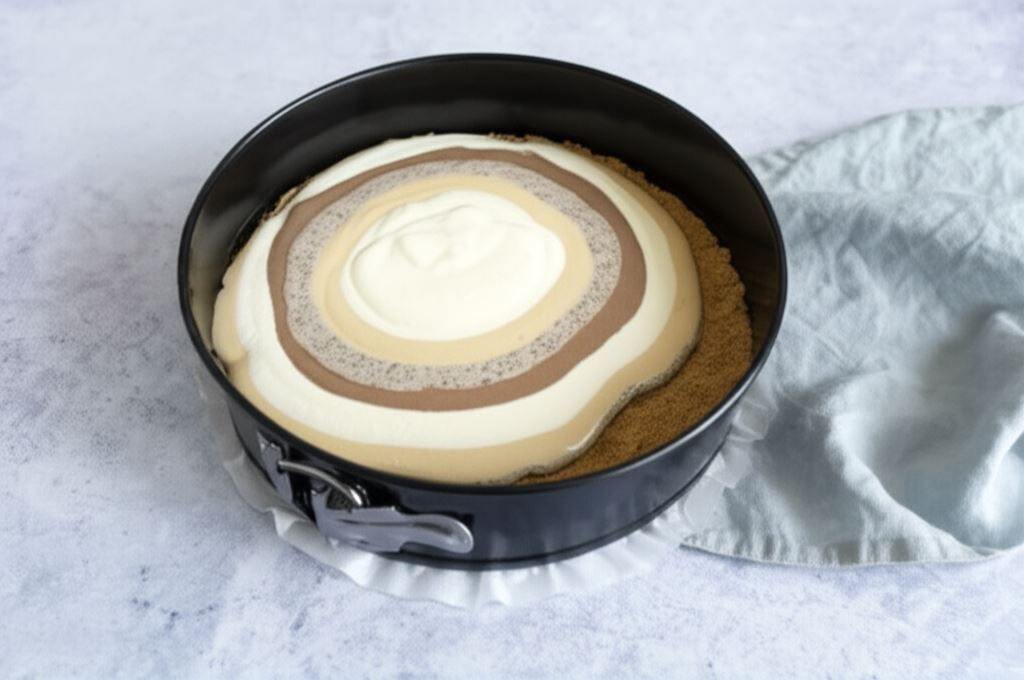 Wyjmij tortownicę z chłodziarki. Na centralną część przygotowanego wcześniej spodu wlewaj po kolei po 2 łyżki każdej masy. Powtarzaj ten proces aż do zużycia zawartości wszystkich misek.