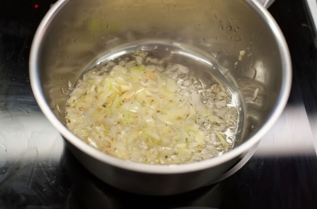 W dużym garnku lub rondlu na rozgrzanym tłuszczu zeszklij pokrojoną cebulę z czosnkiem.