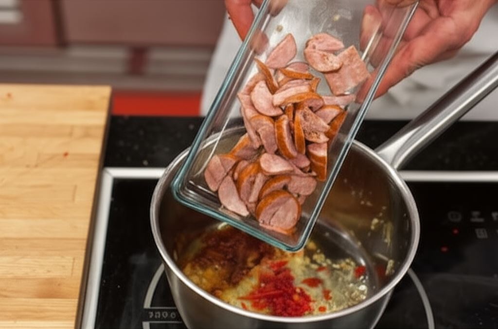 Wsyp drobno posiekaną papryczkę chili, słodką paprykę w proszku i pokrojoną w półplasterki kiełbasę.