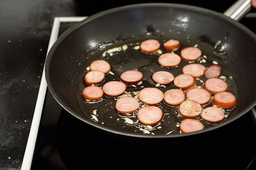 Kiełbasę pokrój na cienkie plasterki i obsmaż na gorącej oliwie. Czosnek posiekaj na drobno i dorzuć do kiełbasy.