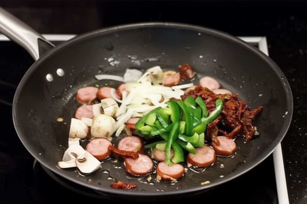Cebulę, paprykę i pomidory pokrój w cienkie paski, umieść je na patelni i smaż wraz z chorizo. Dodaj także pieczarki pokrojone w ósemki.