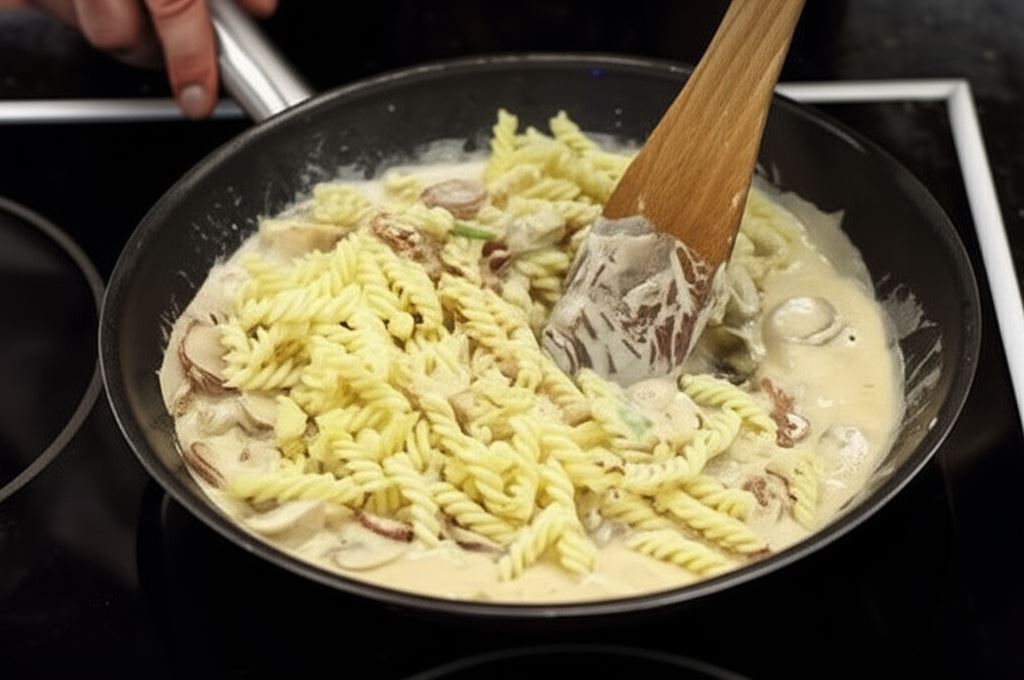 Makaron ugotuj al dente, po czym odcedź. Fix Knorr wymieszaj z bulionem i śmietaną.