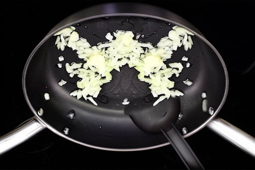 Na patelni podgrzej olej i zrumień posiekany czosnek oraz cebulę.