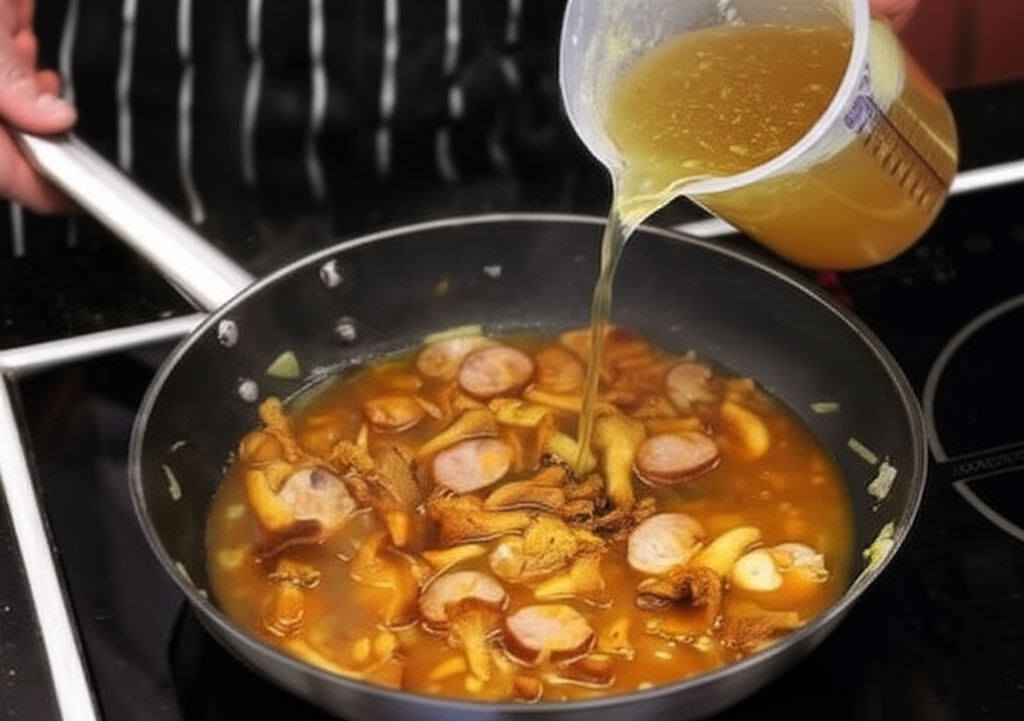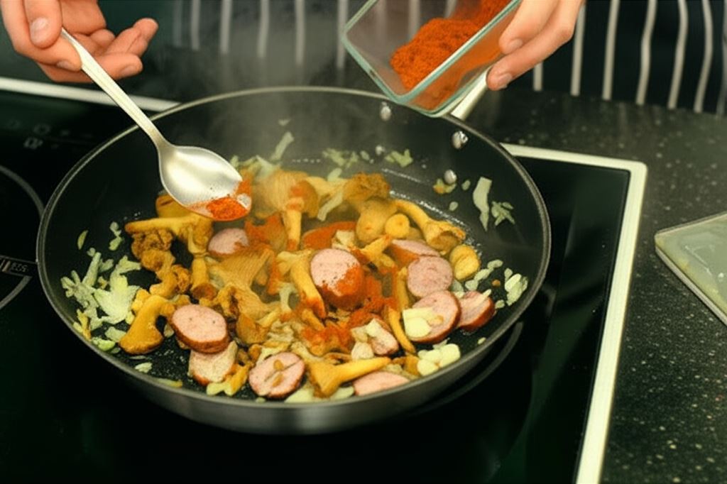 Po chwili wrzuć kiełbasę pokrojoną na plastry oraz oczyszczone i osuszone kurki. Dodaj szczyptę papryki.