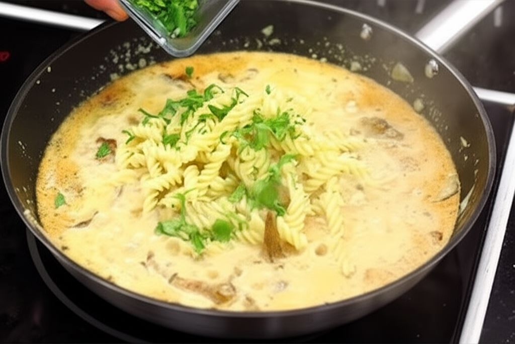 Wrzuć do sosu makaron i posiekaną natkę pietruszki. Gotuj całość do momentu, aż składniki się połączą i sos stanie się gęstszy.