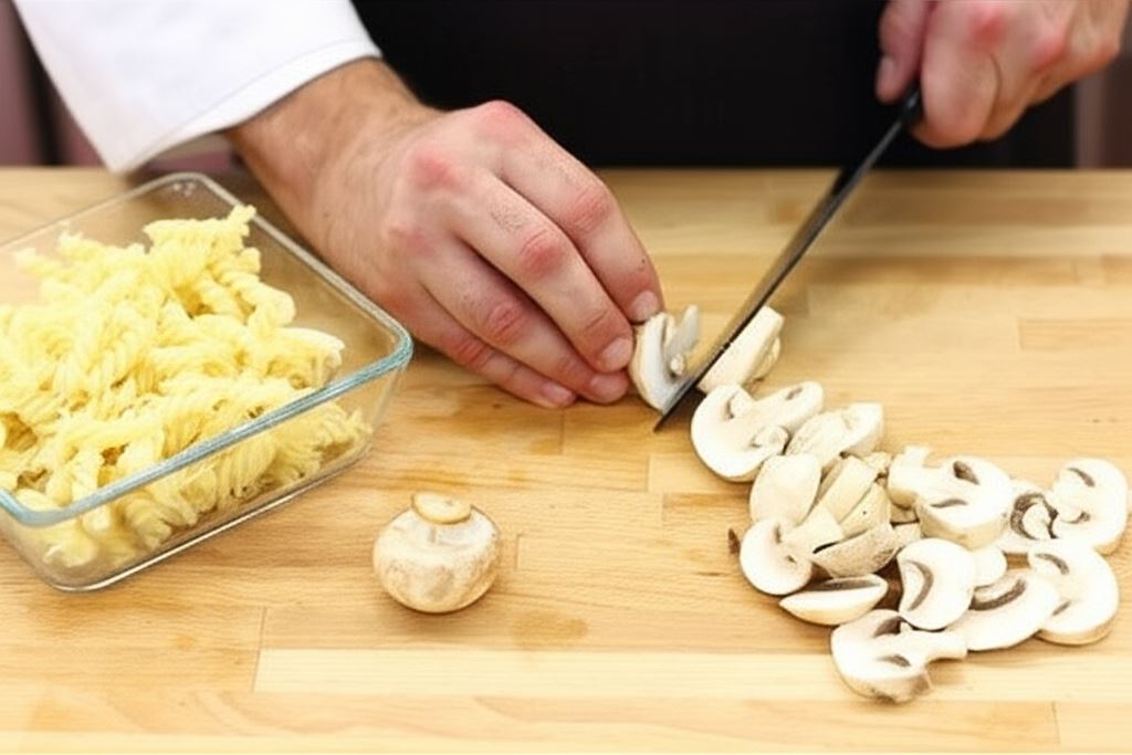 Makaron ugotuj na półtwardo i odcedź. Pieczarki pokrój na grube plastry.