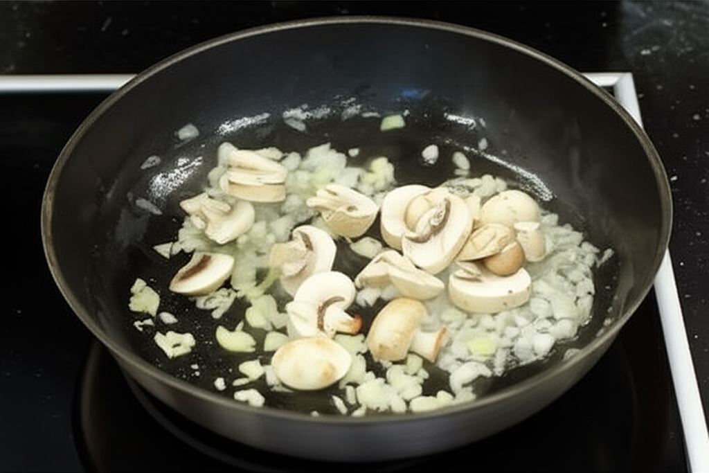 Czosnek i cebulę posiekaj na drobno i podsmaż na gorącej oliwie. Dodaj pieczarki i smaż przez moment.