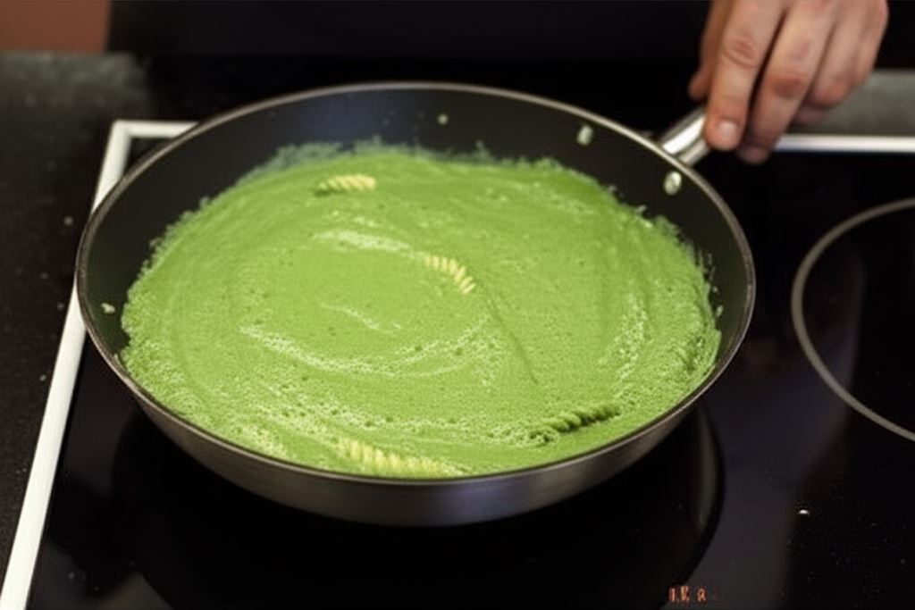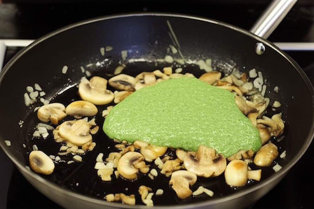 Zmiksuj bulion w blenderze razem ze szpinakiem, mlekiem i Fixem Knorr. Potem przelej na patelnię z pieczarkami i zagotuj. Zredukuj ogień i gotuj przez kolejne 5 minut.