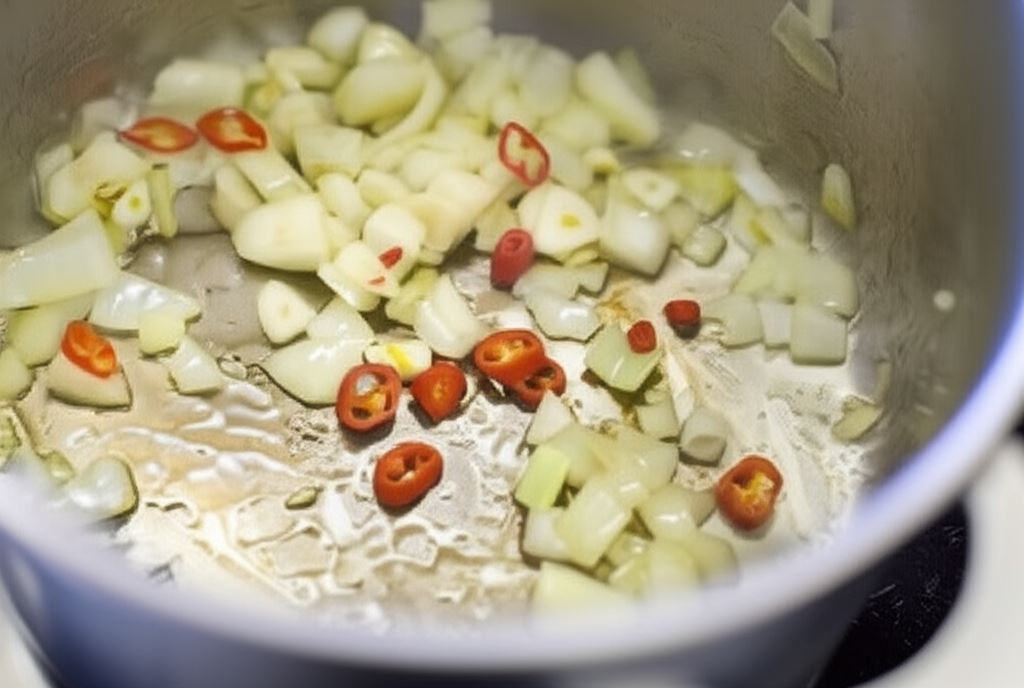 W dużym garnku podgrzej oliwę. Podsmaż najpierw cebulę, potem dodaj posiekany czosnek i papryczkę chilli.