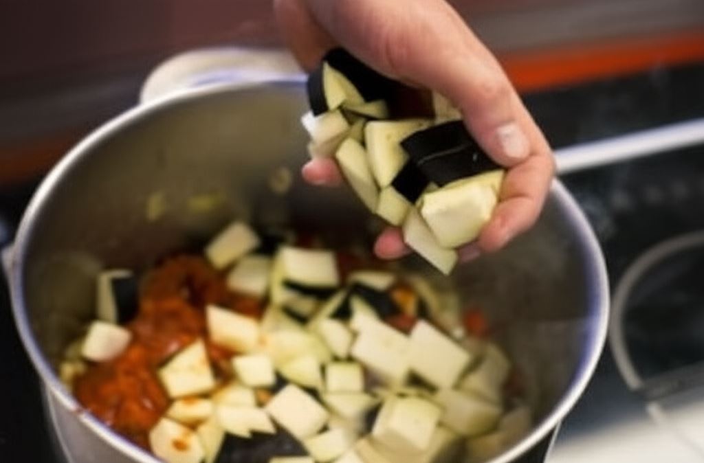 Dorzuć bakłażana, selera, oliwki i całe pomidory.