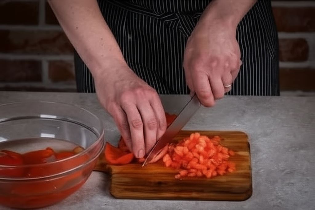 Obgotuj pomidory do szakszuki z piekarnika. W tym celu usuń z nich szypułkę, a dół warzywa lekko natnij na krzyż. Pomidory zanurz na ok. 10 sekund we wrzątku, po czym w zimnej wodzie. Zdejmij skórkę, która powinna już łatwo odchodzić i przekrój je na połówki. Pozostały miąższ pomidorowy posiekaj w kosteczkę. W identyczną kosteczkę na desce kuchennej pokrój cebulę dymkę i paprykę. Przygotuj również inne składniki – posiekaj szczypior, czosnek, chili oraz kolendrę.