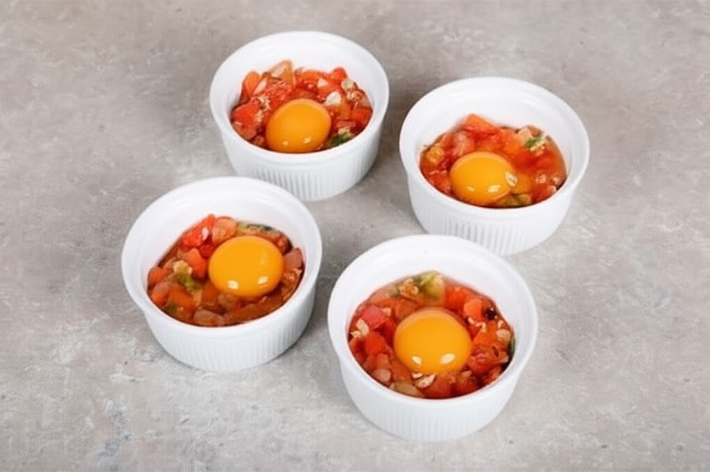 Szakszuka z papryką i pomidorami jest już niemal gotowa. Podsmażone składniki umieść w małych naczyniach żaroodpornych. Do każdego naczynia wbij jajko kurze. Miseczki włóż do rozgrzanego do 160°C piekarnika na około 10 minut. Skończone!