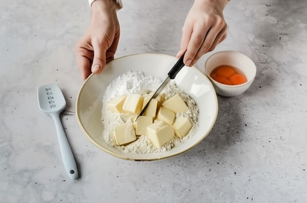 Mąkę z proszkiem do pieczenia przesiewamy do miski. Dodajemy zimne masło pokrojone w kostkę i siekamy nożem. Dodajemy żółtka, cukier i zagniatamy ciasto.