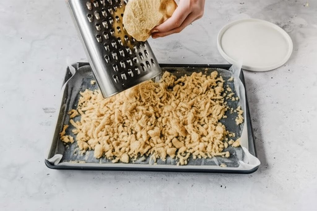 Formę wykładamy papierem do pieczenia. Na dno ścieramy na tarce ciasto i dociskamy ręką. Pieczemy, aż się zrumieni w temp 180 ° C około 20 min.