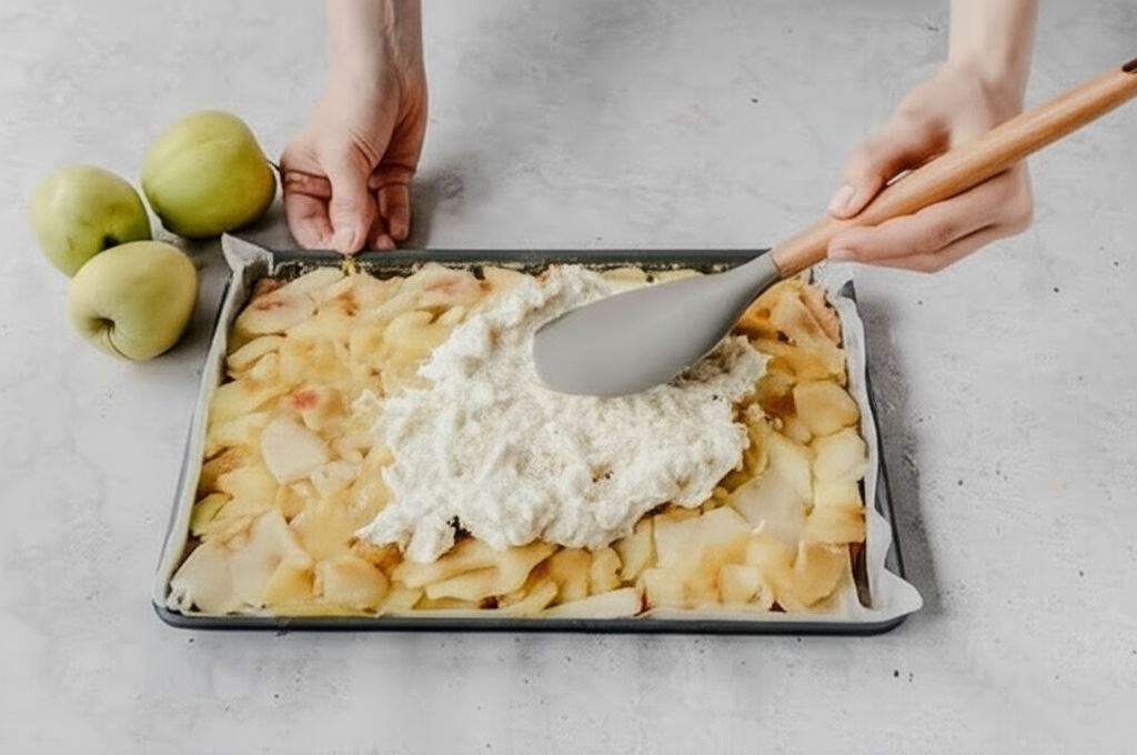 Sekret tego wypieku tkwi w idealnie wyważonych proporcjach składników oraz w odpowiednim czasie pieczenia. Najpierw podpiekamy kruchy spód, następnie układamy warstwę jabłek doprawionych sokiem z cytryny, a na wierzchu rozprowadzamy puszystą bezę wzbogaconą wiórkami kokosa. Całość pieczemy do uzyskania złocistego koloru bezy.