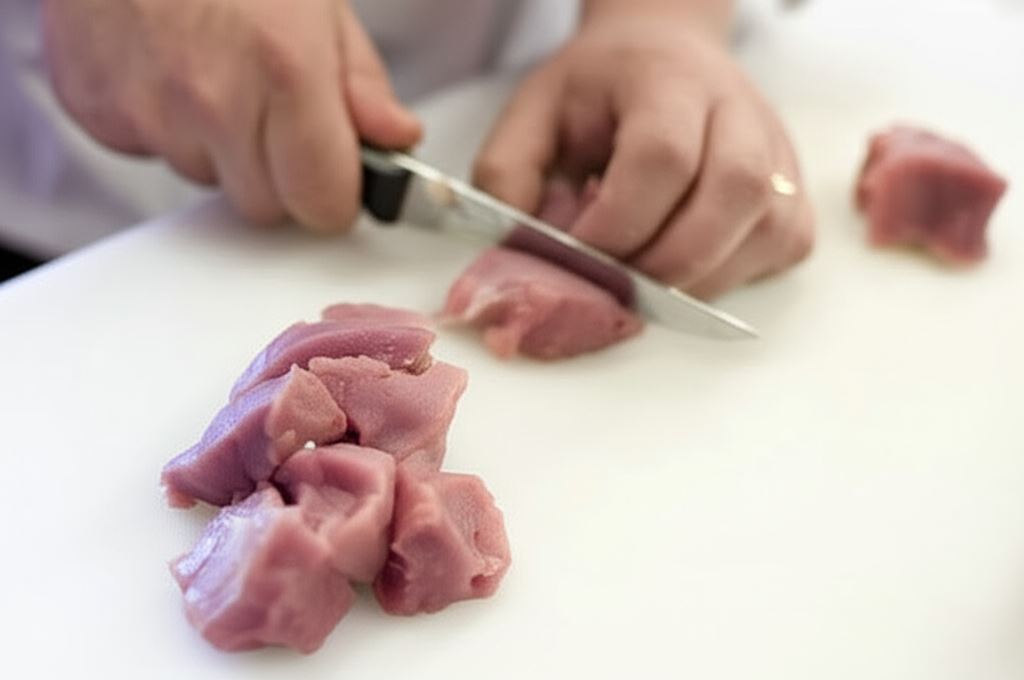Mięso oczyść z błonek. Potem pokrój w kostkę o wymiarze 1,5 centymetra.