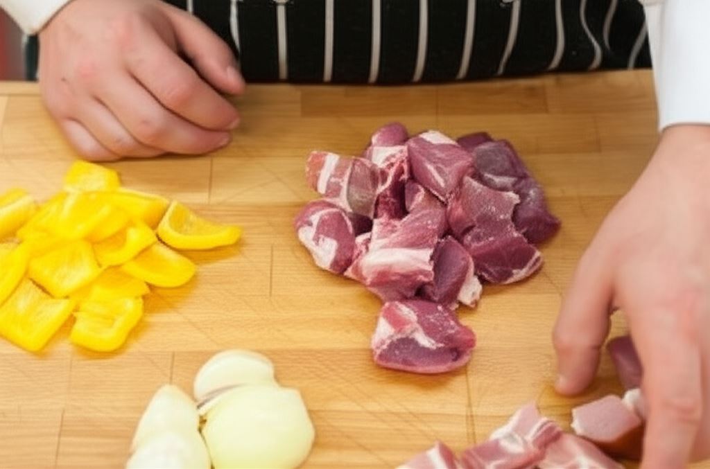 Mięso, cebulę i paprykę potnij w grubą kostkę, a boczek na drobniejsze kawałki. Jeżeli wolisz, by potrawa była lżejsza, boczek możesz zamienić cukinią.