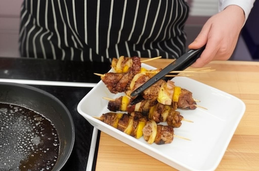 Szaszłyki przysmażaj na patelni po obu stronach, po czym zapiekaj przez 30 minut w piekarniku rozgrzanym do 240 °C.