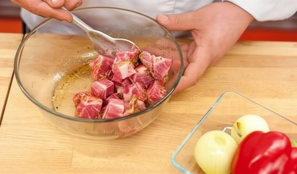 Mięso potnij w kawałki o wymiarze około 2 cm. Potem zamarynuj w oleju oraz przyprawie Knorr.