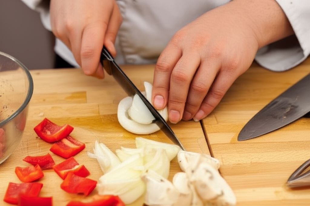 Papryki opłucz i posiekaj w kostkę zbliżonej wielkości co mięso. Cebulę podziel na ćwiartki, a pieczarki przekrój na połowy.
