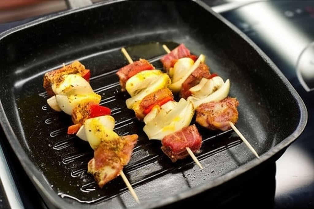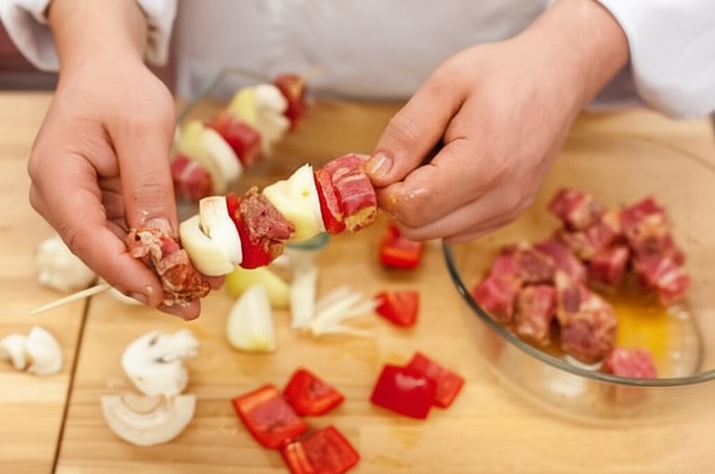 Mięso pokrojone w kostkę o boku około 2 cm, zamarynowane w oleju i aromatycznej przyprawie Knorr, nabiera wyrazistego smaku i rumianego koloru podczas grillowania. Kolorowe papryki, cebula pokrojona na ćwiartki i połówki pieczarek dopełniają całości, tworząc idealnie zbalansowaną przekąskę.