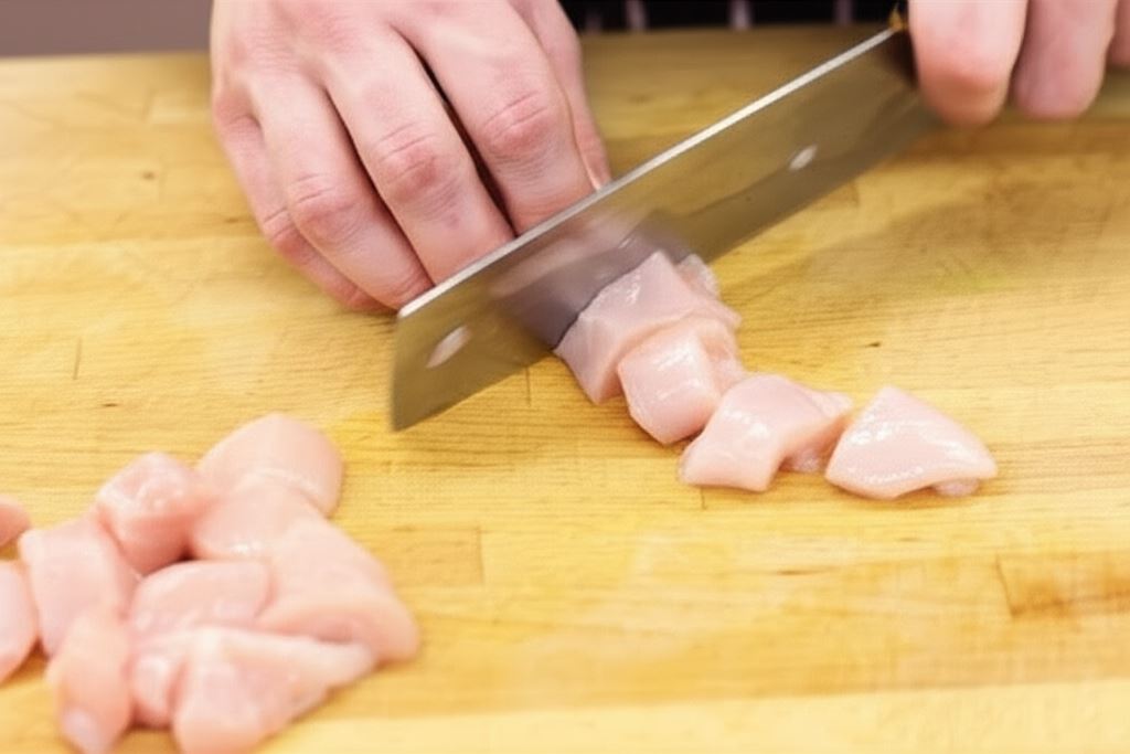 Mięso przeznaczone na szaszłyki z kurczaka potnij w kostkę o wymiarze 2 cm.