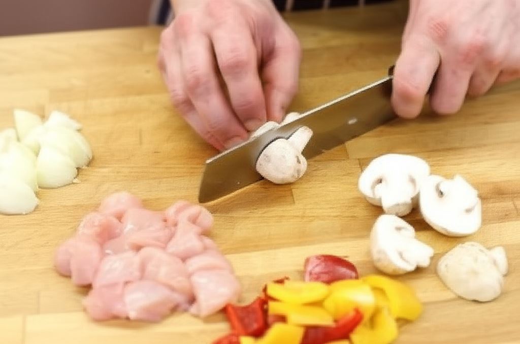 W podobny sposób pokrój papryki. Cebulę podziel na ćwiartki, a pieczarki przekrój na pół.