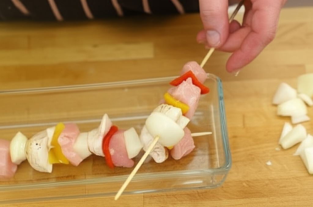 Nadziewaj na patyczki do szaszłyków naprzemiennie kawałki mięsa oraz paprykę, pieczarki i cebulę.