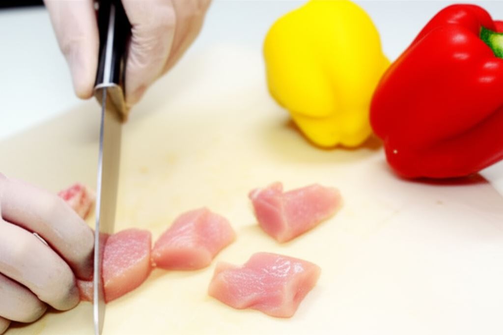 Opłucz filety kurczaka i pokrój je w kostkę o boku trzy centymetry.