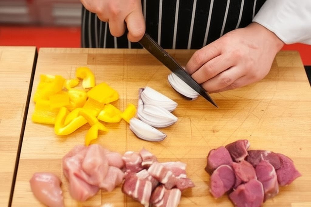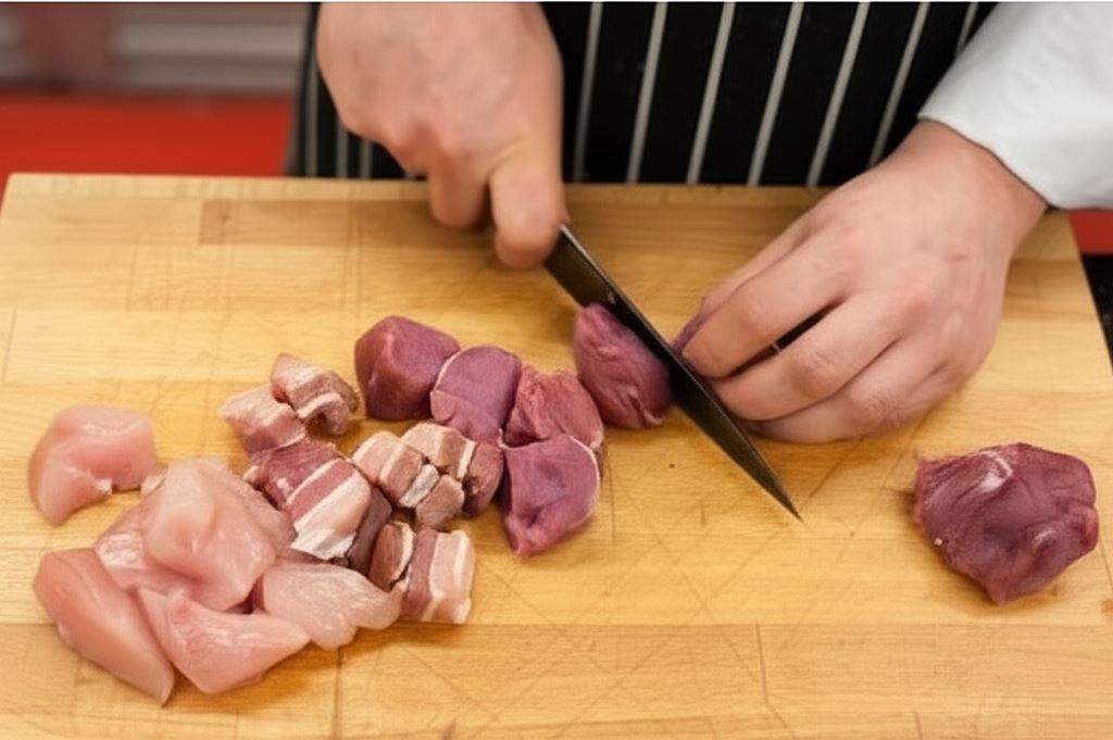 Pokrój wszystkie mięsa na duże kawałki o wymiarze 2-3 cm.