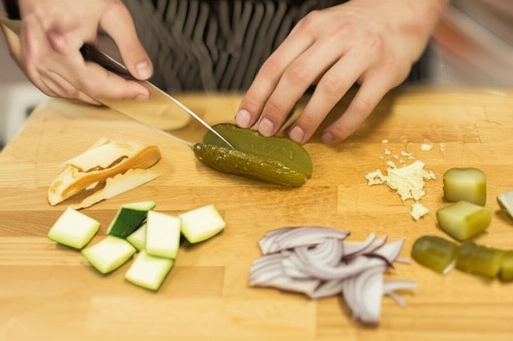 Posiekaj czosnek, czerwoną cebulę pokrój w piórka, ogórka i oscypka podziel na cztery części. Cukinię również podziel na cztery części i usuń gniazdo nasienne, po czym pokrój na grubą kostkę. Z cytryny zetrzyj skórkę i wyciśnij sok.