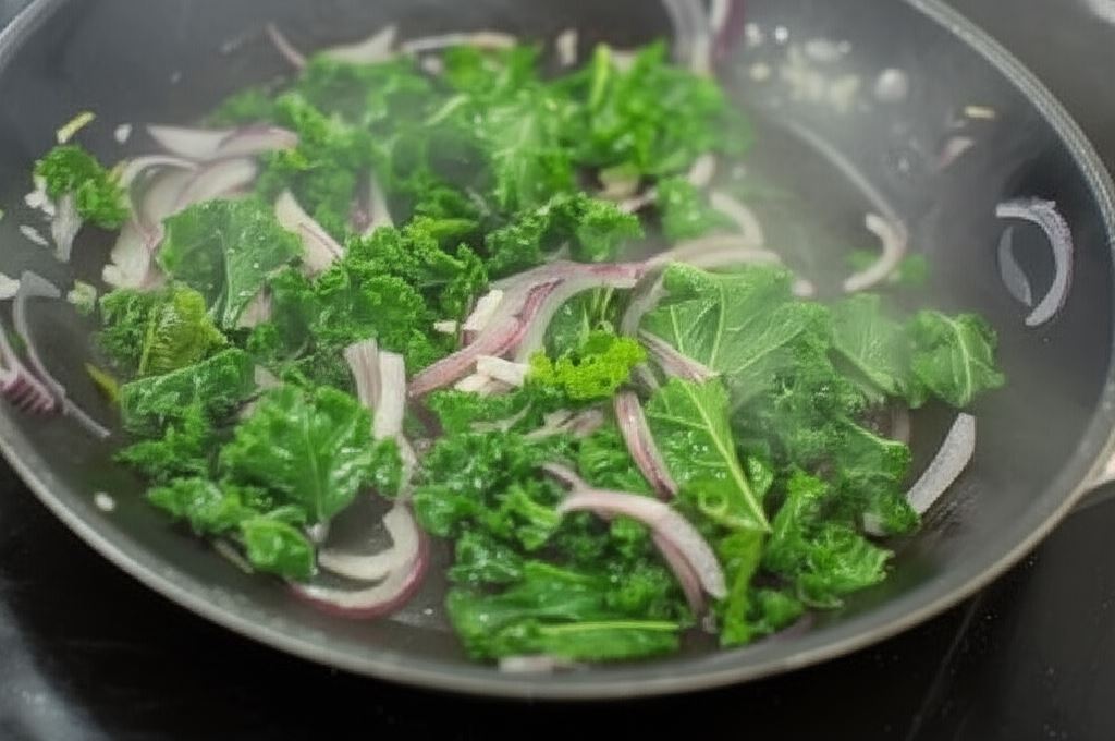 Rozgrzej na patelni dwie łyżki oliwy. Na niej podsmaż czosnek i szalotkę, następnie dodaj jarmuż i smaż moment, aż jarmuż zmieni kolor. Dolej do całości jedną lub dwie łyżki wody. Smaż do momentu, gdy woda całkowicie odparuje.