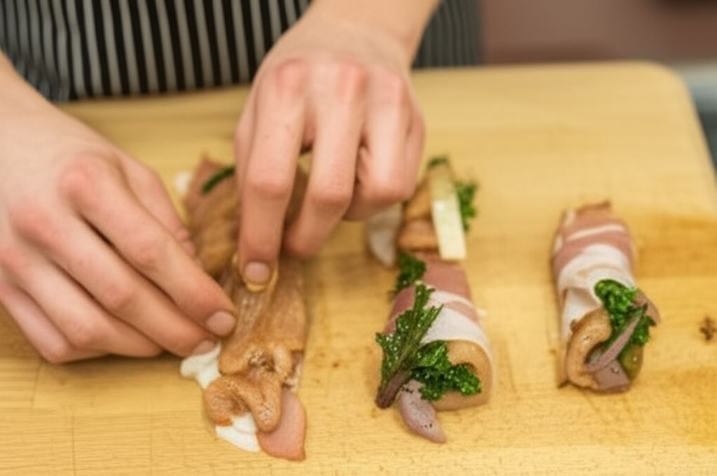 Na kawałek marynowanego indyka połóż podsmażony jarmuż, fragment ogórka i oscypka. Całość dokładnie zroluj, owiń w szynkę parmeńską.