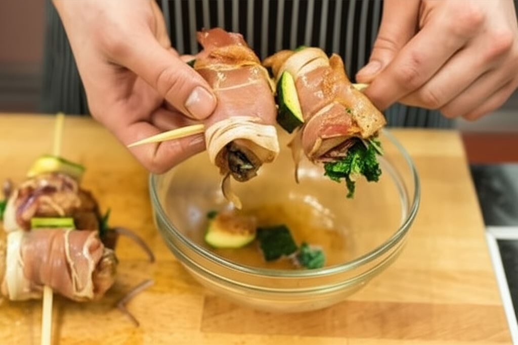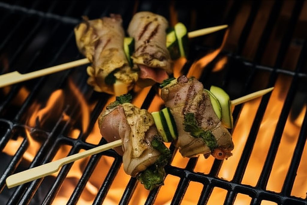 Odkryj wyjątkowe połączenie delikatnej piersi indyka, aromatycznej szynki parmeńskiej i wyrazistego oscypka w formie soczystych szaszłyków. To danie, które zachwyca nie tylko smakiem, ale i wyglądem – kolorowe roladki nadziane jarmużem i ogórkiem kiszonym, otulone chrupiącą szynką, grillowane do perfekcji razem z aromatyczną cukinią.