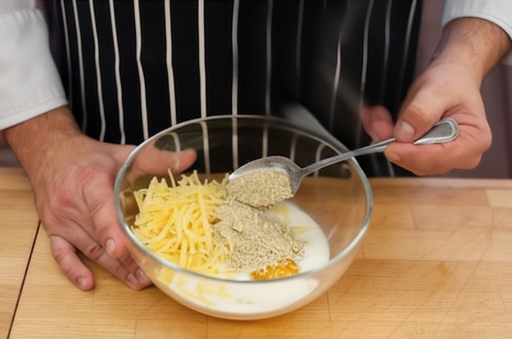 Sporządź ciasto, łącząc razem jajko, zupę cebulową, mąkę, mleko i żółty ser. Możesz dorzucić do panierki rozdrobnione orzechy lub ziarna słonecznika. Sznycle staną się wtedy bardziej chrupiące.